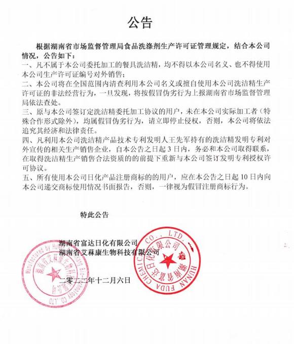 四、凡利用(yòng)本公司洗潔精(jīng)產品技術專利發明人王先軍持有的洗潔精發明專利對外宣傳的相關生產銷售企業(yè),自本公告之(zhī)日起3日內,務必和本公司取得聯係,在取得洗潔精生產銷售合法資質的的前提下重新與本公司(sī)簽訂發明專利授權許可協議。