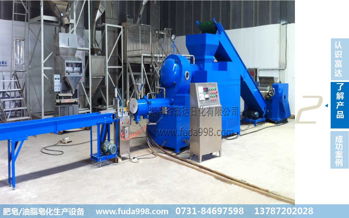 (2)用半成品皂(zào)泥:通(tōng)過從大廠購買皂粒(lì)(皂泥),采用FZ-1000肥皂生產線,主要有三棍研磨機、半成(chéng)品輸送機、雙螺旋真空抽條機、真空泵(bèng)、肥皂滾印切塊機等設(shè)備組件構成,通壓(yā)條,切塊,打印,包裝,最後生產出合格的肥皂。