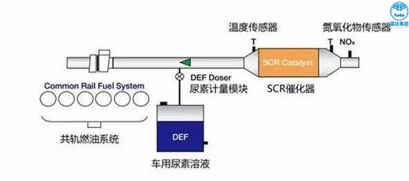SCR係統包括尿素罐(裝車用尿素溶液)、SCR催化反應罐。SCR係(xì)統的運行過程是:當發現排氣管中有氮氧化物(wù)時,尿素罐自動噴出車用尿素(sù)溶液,尿素溶液(yè)和(hé)氮氧化物在SCR催化(huà)反應罐中發生氧化還原反應,生成無汙染(rǎn)的氮氣和水蒸氣排出。
